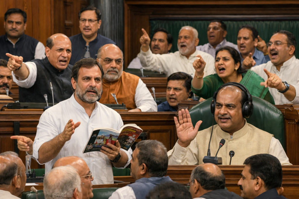 इस पर ओम बिरला ने राहुल गांधी को लेख पढ़ने से रोक दिया।इसके बाद सदन में नोकझोंक तेज हो गई और सत्ता पक्ष तथा विपक्ष के सांसद आमने-सामने आ गए। हंगामे के चलते लोकसभा की कार्यवाही पहले कुछ समय के लिए और बाद में पूरे दिन के लिए स्थगित कर दी गई।